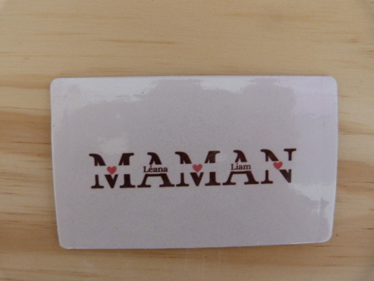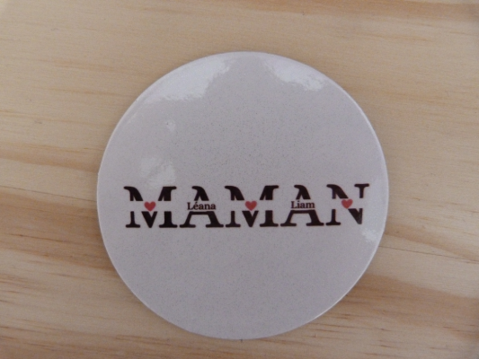 Aimant de frigo personnalisé (rectangle ou rond), sublimé avec le mot MAMAN traversé par une bande blanche où s’inscrivent les prénoms des enfants, séparés par des petits cœurs. Sobre, tendre, unique.
