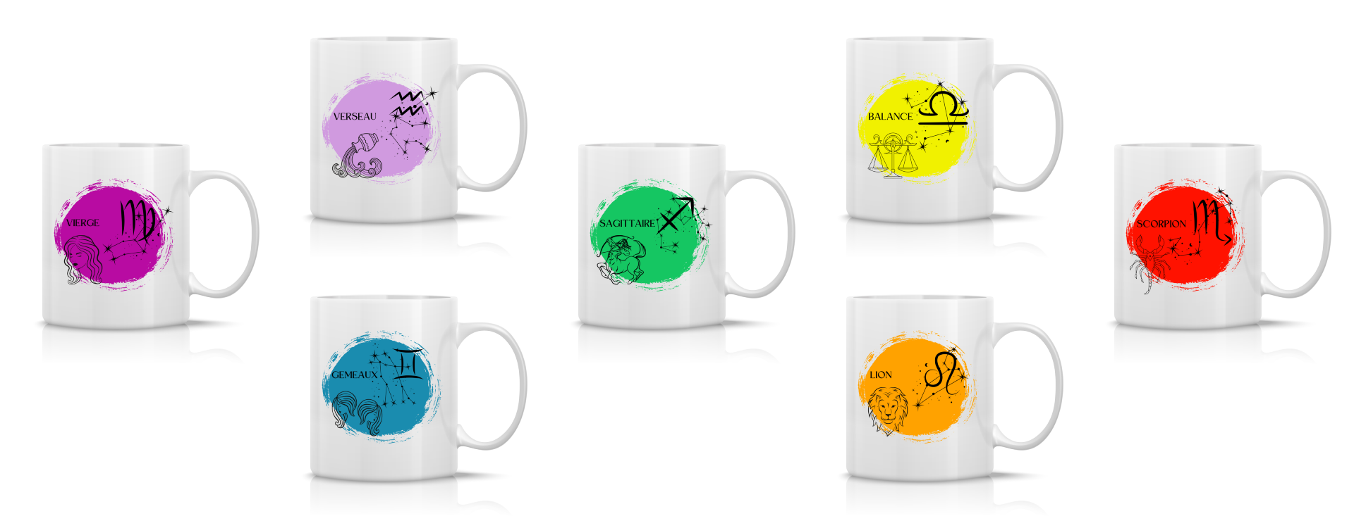 Plongez dans l’univers fascinant de l’astrologie avec notre collection de tasses « Zodiaque », une touche d’originalité et de symbolisme pour chaque signe astrologique. Chaque tasse est conçue avec un fond effet « coup de pinceau » élégant, disponible dans 7 couleurs soigneusement sélectionnées, qui apportent une touche artistique et colorée. Sur ce fond, vous trouverez une illustration raffinée représentant votre signe du zodiaque, accompagnée de son symbole et de l’astre étoilé qui lui est associé. Le nom du signe est aussi présent, offrant ainsi un design harmonieux et équilibré.